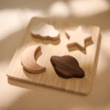 • Design: Wolken-, Stern-, Mond- und Planetenformen als Puzzleteile auf einer Bambusplatte