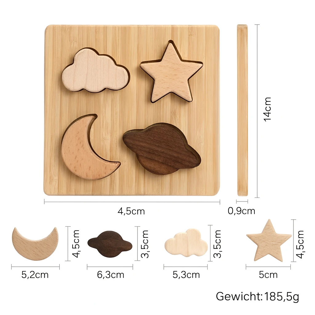 Das Kosmische Holzpuzzle ist ein Montessori-inspiriertes Spielzeug aus hochwertigem Holz und Silikon, das Fingerfertigkeit, räumliches Denken und Problemlösungsfähigkeiten fördert. Mit seinen liebevoll gestalteten Wolken, Sternen und Planeten weckt es die Kreativität und Fantasie von Kindern. CE-zertifiziert und sicher, ist es ideal für Kinder im Alter von 3–12 Jahren. Perfekt als Lernspielzeug und kreatives Geschenk für kleine Entdecker.